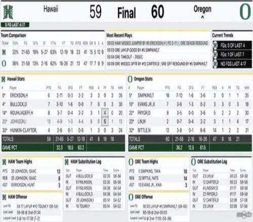 最终,俄勒冈大学60-59夏威夷大学,林葳首发出场17分钟,投篮7中0,三分4中0,罚球2中2,得到2分3篮板1助攻,并出现了4次失误和1次犯规。