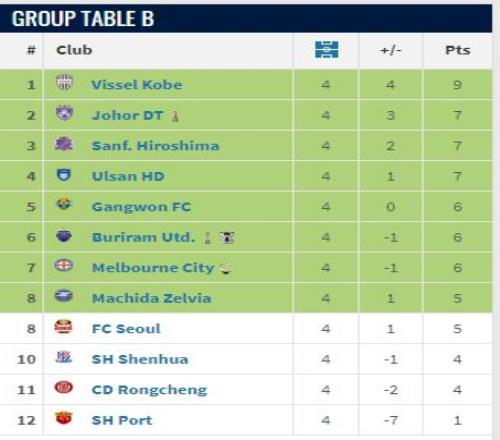 前4轮之后,上海海港以1分在东亚区垫底,而上海申花、成都蓉城分别排名第10位、第11位,三支中超球队包揽了东亚后三位。