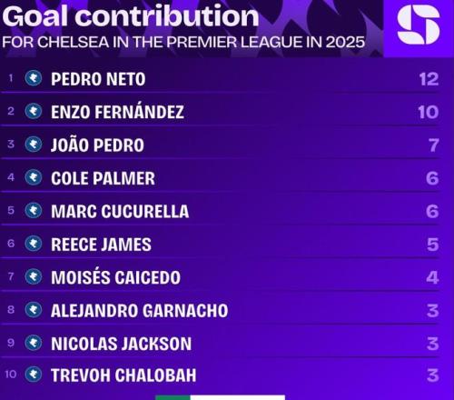 英超第11轮比赛,切尔西3-0战胜狼队,佩德罗-内托破门,据足球数据统计网站Squawka的统计,佩德罗-内托2025年在英超打进6粒进球,贡献助攻6次,他是切尔西队内同期唯一英超进球5+且助攻5+的球员。