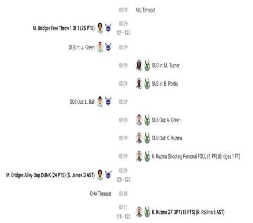 终场前1分34秒库兹马制造了米勒一个进攻犯规,随后罗林斯三分命中反超1分,紧接着布里奇斯突破命中黄蜂再领先1分,终场前11秒库兹马命中反超2分的关键三分球。