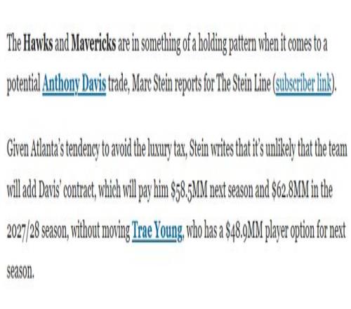 斯坦因写道,鉴于老鹰队向来有规避奢侈税的倾向,若不将特雷-杨纳入交易筹码,他们基本不可能接手戴维斯的合同——戴维斯下赛季薪资为5850万美元,2027-28赛季则为6280万美元,而特雷-杨下赛季拥有4890万美元的球员选项。